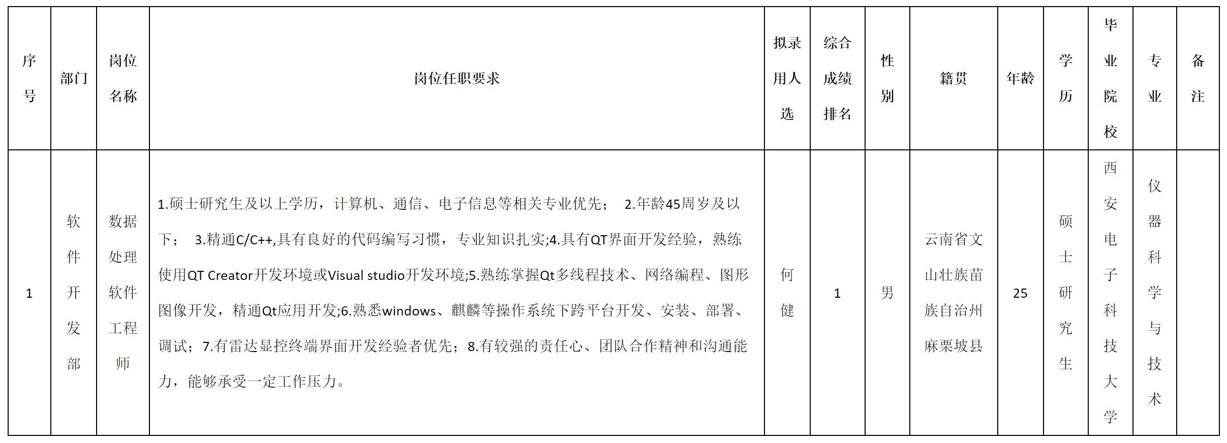 根據(jù)四川九洲防控科技有限責(zé)任公司發(fā)布的招聘公告及招聘相關(guān)規(guī)定,經(jīng)測(cè)試、考察、體檢等程序,擬錄用何健同志到四川九洲防控科技有限責(zé)任公司工作,現(xiàn)予以公示,具體情況如下: