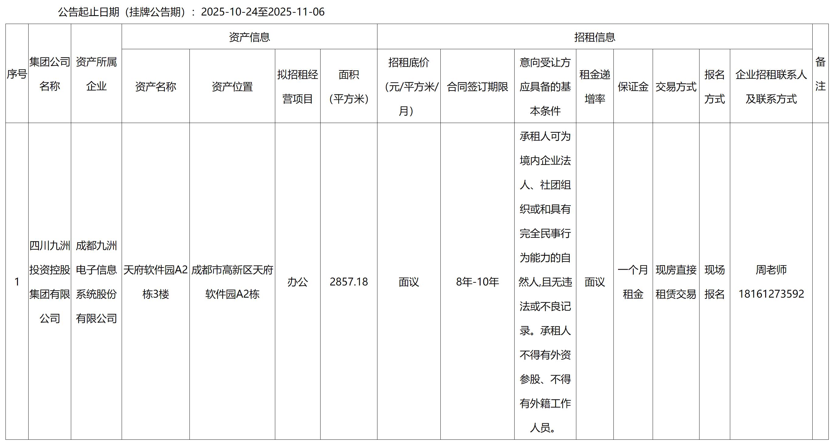 成都九洲電子信息系統(tǒng)股份有限公司資產(chǎn)出租公告