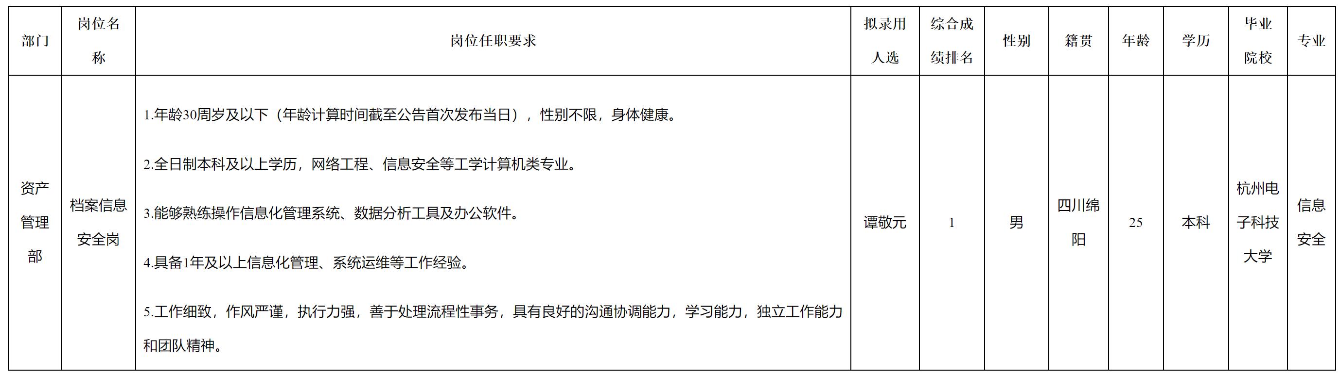 根據(jù)綿陽市綿投商業(yè)運營管理有限責任公司發(fā)布的招聘公告及招聘相關(guān)規(guī)定,經(jīng)筆試、面試、背景調(diào)查、體檢等程序,擬錄用譚敬元同志到綿陽市綿投商業(yè)運營管理有限責任公司工作,現(xiàn)予以公示,具體情況如下: