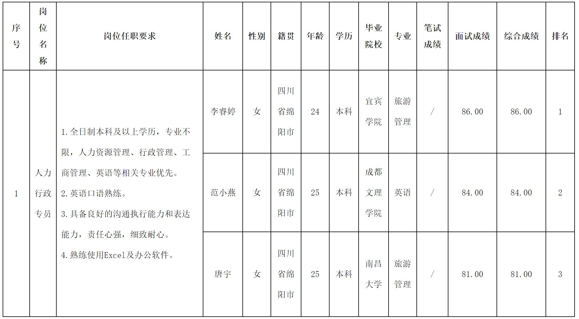 根據(jù)四川波鴻實業(yè)有限公司發(fā)布的招聘公告及招聘相關規(guī)定,現(xiàn)將測試成績予以公示。