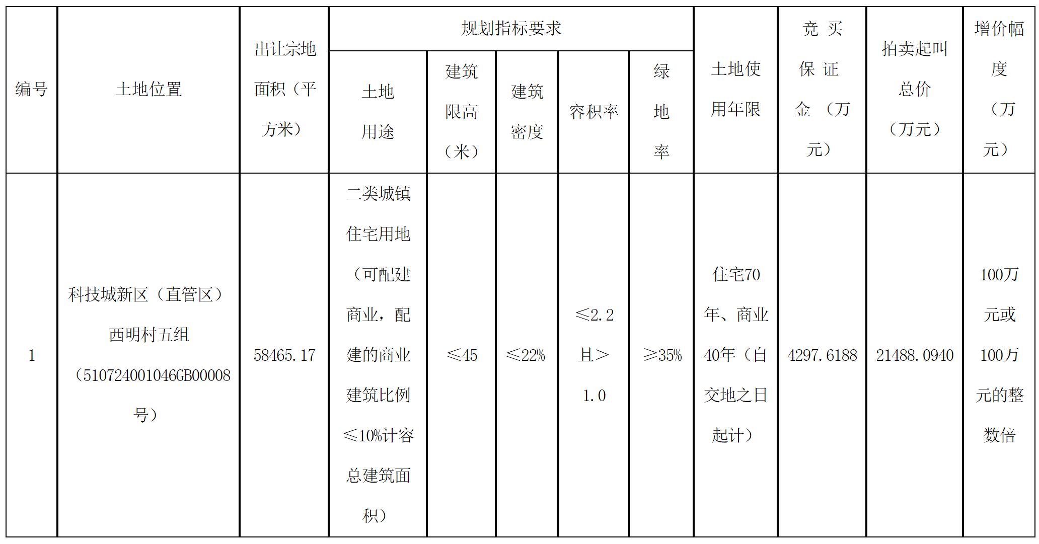 經(jīng)綿陽市人民政府批準(zhǔn),綿陽科技城新區(qū)管理委員會(huì)決定以拍賣方式出讓一宗國(guó)有建設(shè)用地使用權(quán),綿陽市公共資源交易服務(wù)中心具體組織實(shí)施本次拍賣出讓活動(dòng),現(xiàn)將有關(guān)事項(xiàng)公告如下: