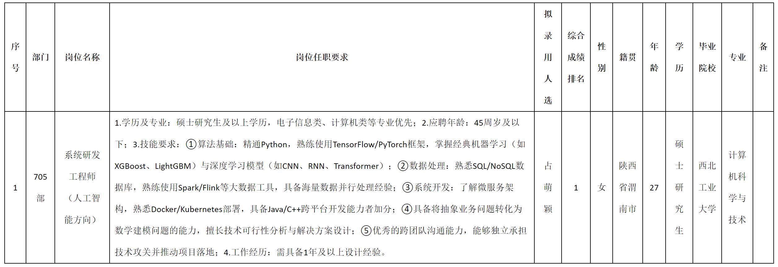根據(jù)四川九洲電器集團(tuán)有限責(zé)任公司發(fā)布的招聘公告及招聘相關(guān)規(guī)定,經(jīng)測試、考察、體檢等程序,擬錄用占萌穎同志到四川九洲電器集團(tuán)有限責(zé)任公司工作,現(xiàn)予以公示,具體情況如下: