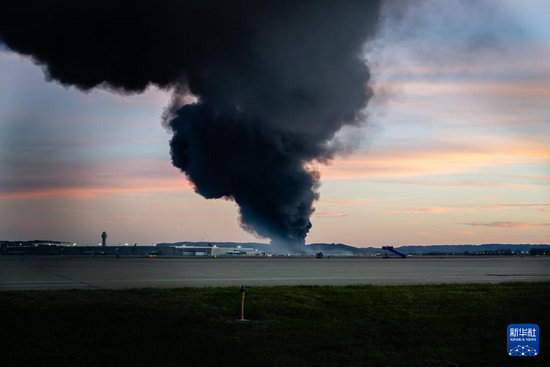 11月4日,在美國(guó)肯塔基州路易斯維爾,貨機(jī)墜毀現(xiàn)場(chǎng)升起濃煙。新華社/美聯(lián)