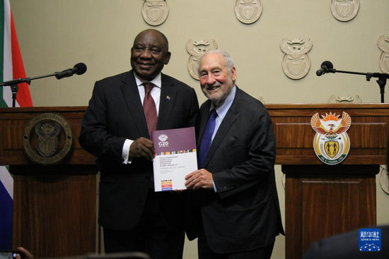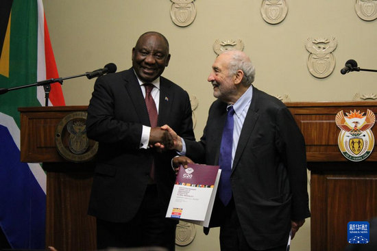 11月4日,在南非立法首都開普敦,二十國集團(tuán)應(yīng)對全球不平等問題特別獨(dú)立專家委員會主席、諾貝爾經(jīng)濟(jì)學(xué)獎得主約瑟夫·施蒂格利茨(右)向南非總統(tǒng)拉馬福薩提交關(guān)于全球不平等問題的報(bào)告。新華社發(fā)(沙姬拉·泰比攝)