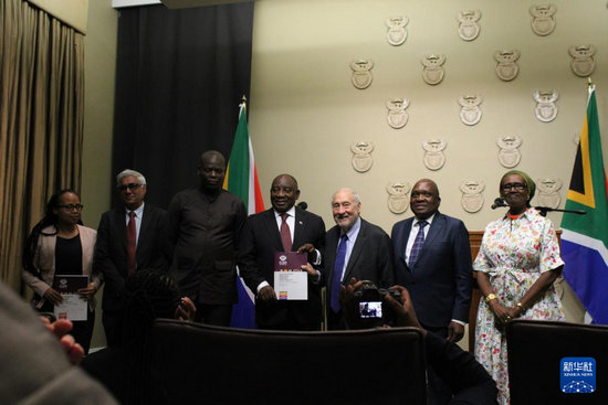 11月4日,在南非立法首都開普敦,二十國集團(tuán)應(yīng)對全球不平等問題特別獨(dú)立專家委員會主席、諾貝爾經(jīng)濟(jì)學(xué)獎得主約瑟夫·施蒂格利茨(右三)和專家委員會成員向南非總統(tǒng)拉馬福薩(右四)提交關(guān)于全球不平等問題的報(bào)告。新華社發(fā)(沙姬拉·泰比攝)