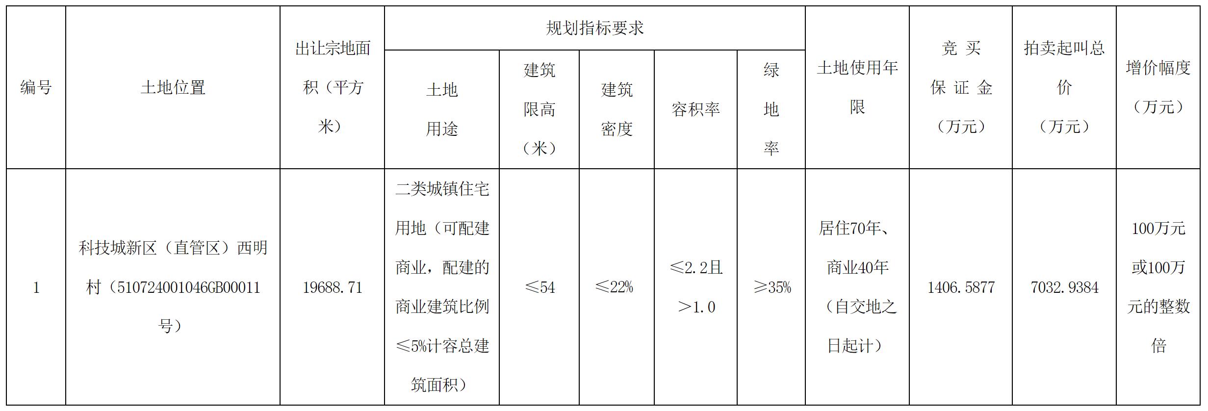 經(jīng)綿陽(yáng)市人民政府批準(zhǔn),綿陽(yáng)科技城新區(qū)管理委員會(huì)決定以拍賣方式出讓一宗國(guó)有建設(shè)用地使用權(quán),綿陽(yáng)市公共資源交易服務(wù)中心具體組織實(shí)施本次拍賣出讓活動(dòng),現(xiàn)將有關(guān)事項(xiàng)公告如下: