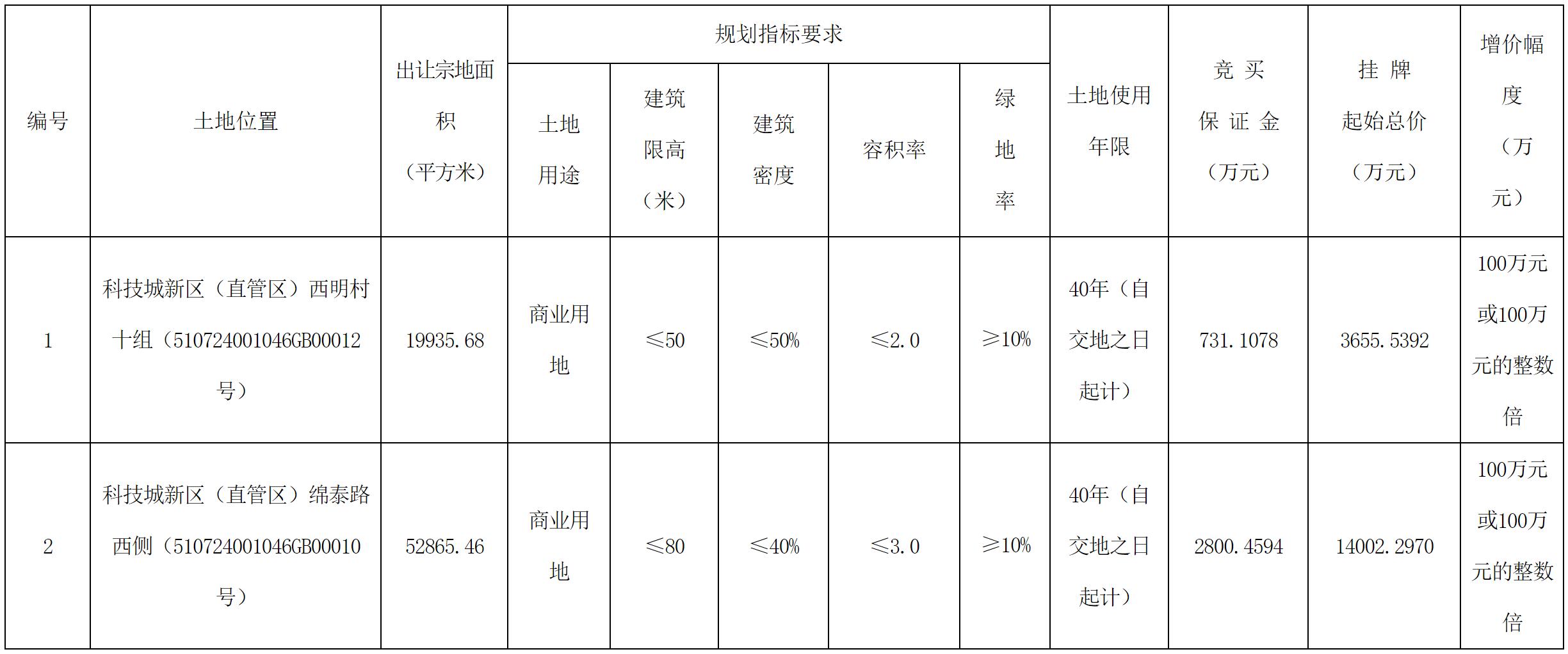 經(jīng)綿陽市人民政府批準(zhǔn),綿陽科技城新區(qū)管理委員會決定以掛牌方式出讓兩宗國有建設(shè)用地使用權(quán),綿陽市公共資源交易服務(wù)中心具體組織實施本次掛牌出讓活動,現(xiàn)將有關(guān)事項公告如下: