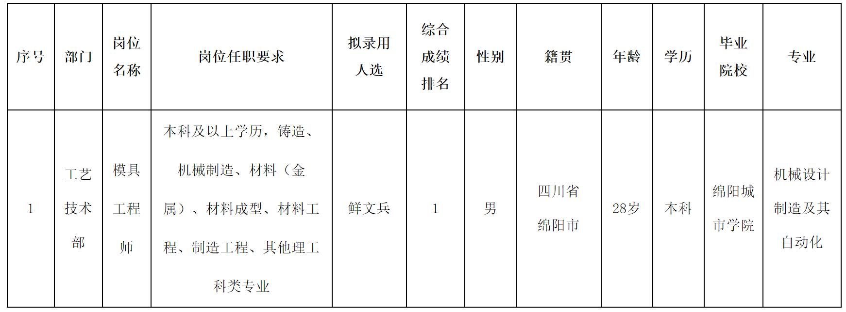 根據(jù)四川波鴻實(shí)業(yè)有限公司發(fā)布的招聘公告及招聘相關(guān)規(guī)定,經(jīng)面試、體檢等程序,擬錄用鮮文兵同志到四川威斯卡特工業(yè)有限公司綿陽分公司工作,現(xiàn)予以公示,具體情況如下: