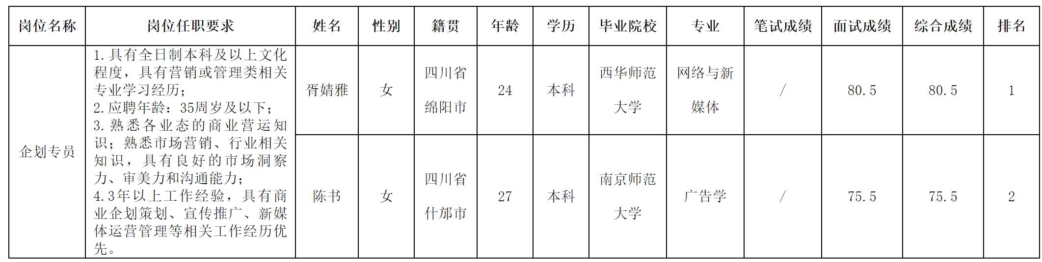 根據(jù)四川長(zhǎng)虹繽紛時(shí)代商業(yè)管理有限公司發(fā)布的招聘公告及招聘相關(guān)規(guī)定,現(xiàn)將測(cè)試成績(jī)予以公示。