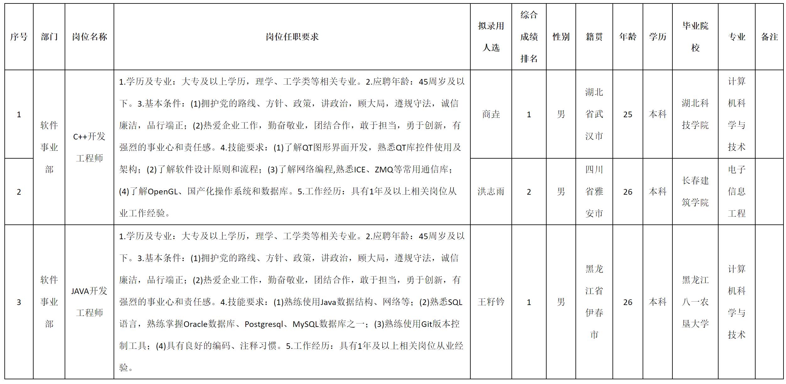 根據(jù)四川九強(qiáng)通信科技有限公司發(fā)布的招聘公告及招聘相關(guān)規(guī)定,經(jīng)測試、考察、體檢等程序,擬錄用商垚等3名同志到四川九強(qiáng)通信科技有限公司工作,現(xiàn)予以公示,具體情況如下: