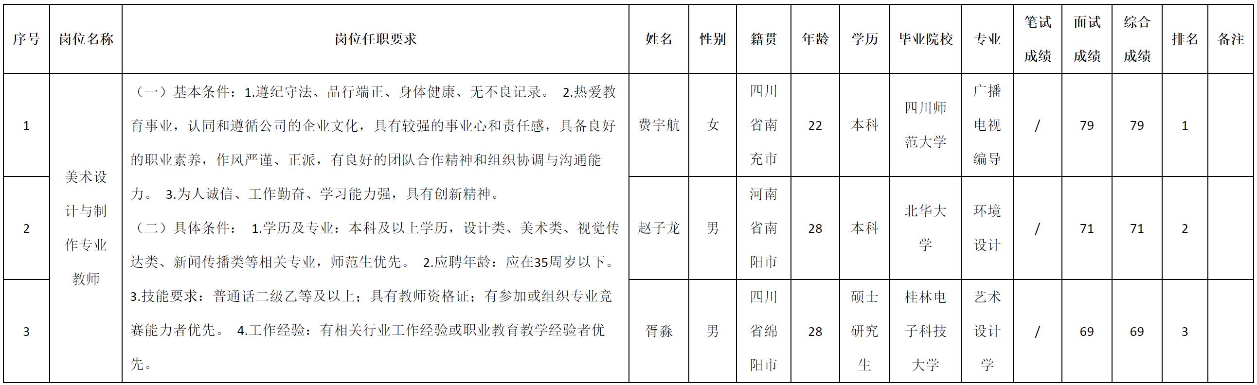 根據(jù)四川九洲教育投資管理有限公司發(fā)布的招聘公告及招聘相關(guān)規(guī)定,現(xiàn)將測試成績予以公示。