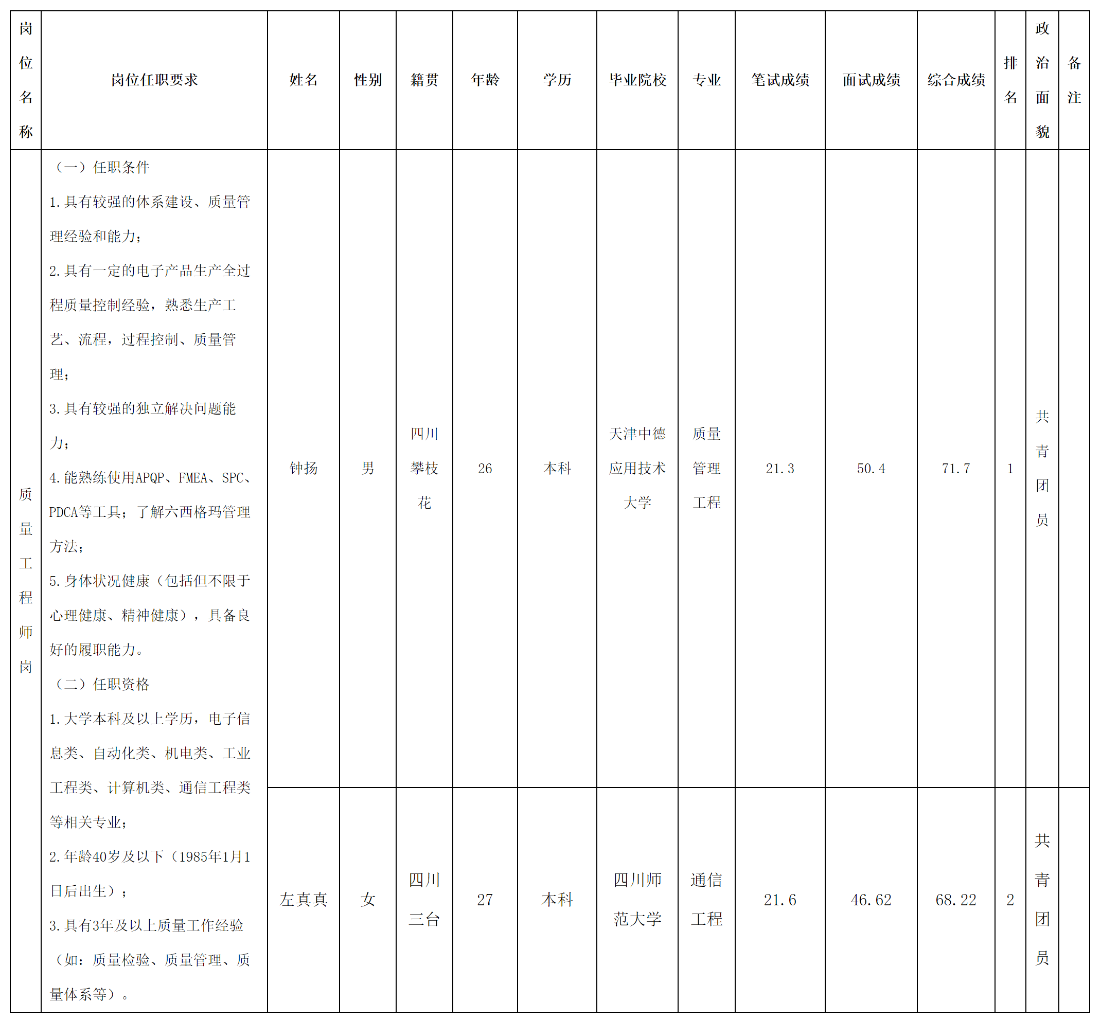 根據(jù)綿陽(yáng)燃?xì)饧瘓F(tuán)發(fā)布的招聘公告及招聘相關(guān)規(guī)定,經(jīng)筆試、面試等程序,現(xiàn)將綿陽(yáng)能創(chuàng)科技有限責(zé)任公司質(zhì)量工程師崗位筆試、面試成績(jī)予以公示。