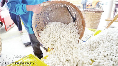 德勝村蠶繭的品質(zhì)好,每當(dāng)蠶繭上市時,便吸引收購商前來收購。廣西蠶繭收購商萬俞林抓起一把蠶繭放在耳邊搖了搖,滿意地說:“這是我們第一次來,預(yù)估收購5至8噸,這里的繭子質(zhì)量非常好,明年我們會繼續(xù)過來收購。”
