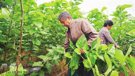 在鹽亭黃甸鎮(zhèn)定光村桑園里,村民正在采摘桑葉。 記者 彭紫薇 攝
