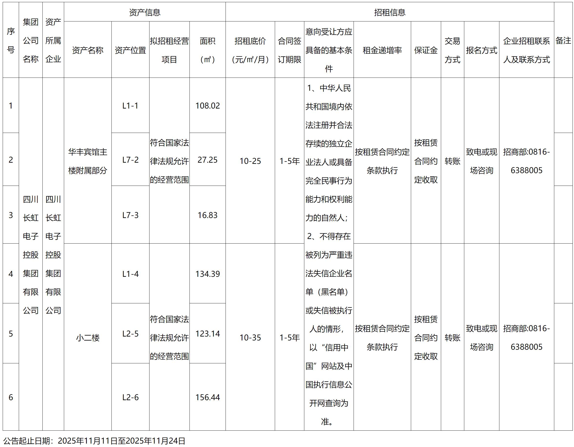 四川長虹電子控股集團有限公司華豐賓館附屬部分資產(chǎn)出租公告