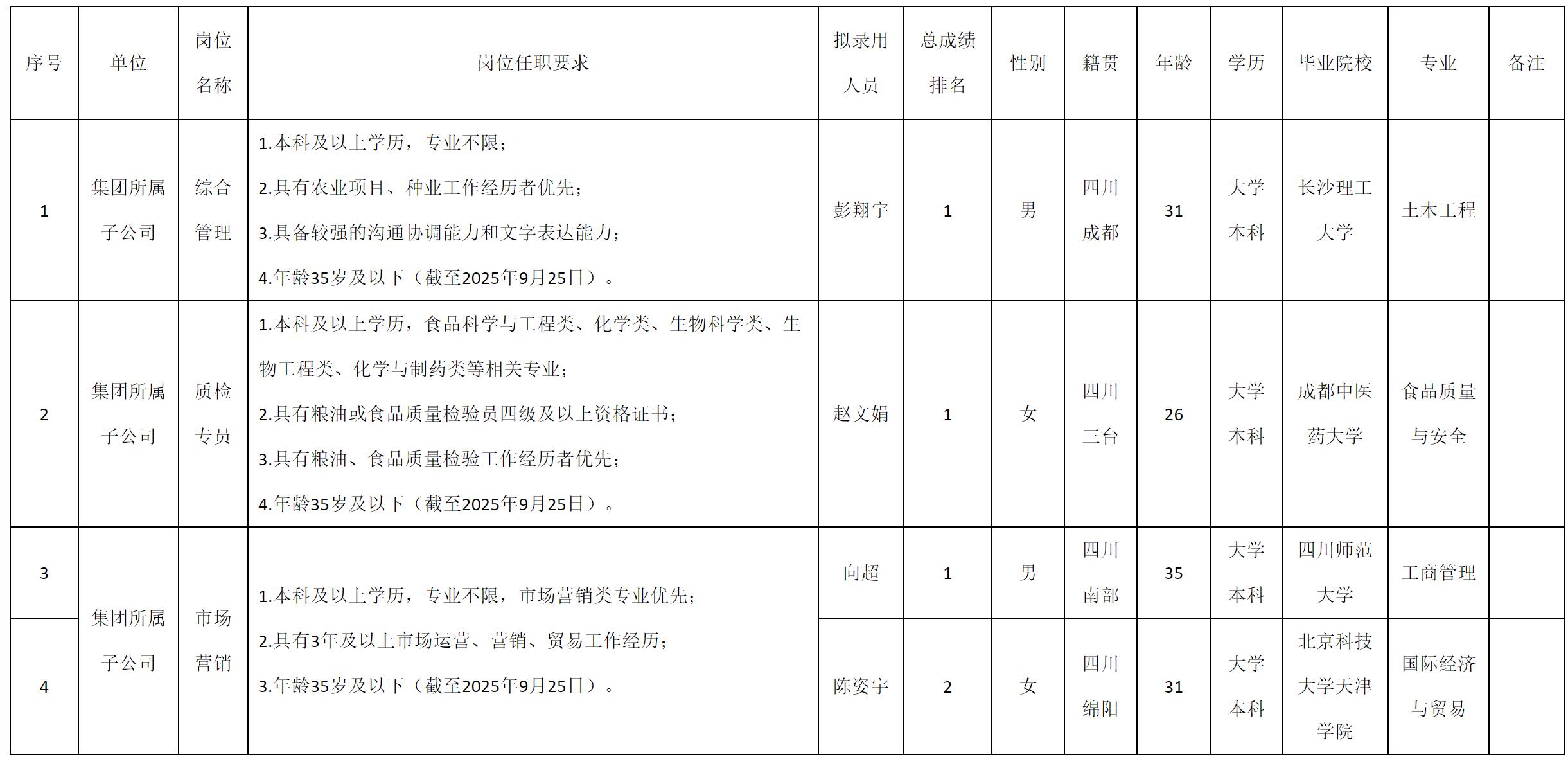 根據(jù)綿陽(yáng)市糧油集團(tuán)有限公司發(fā)布的招聘公告及招聘相關(guān)規(guī)定,經(jīng)筆試、面試、背調(diào)、體檢等程序,擬錄用彭翔宇等同志到糧油集團(tuán)工作,現(xiàn)予以公示。