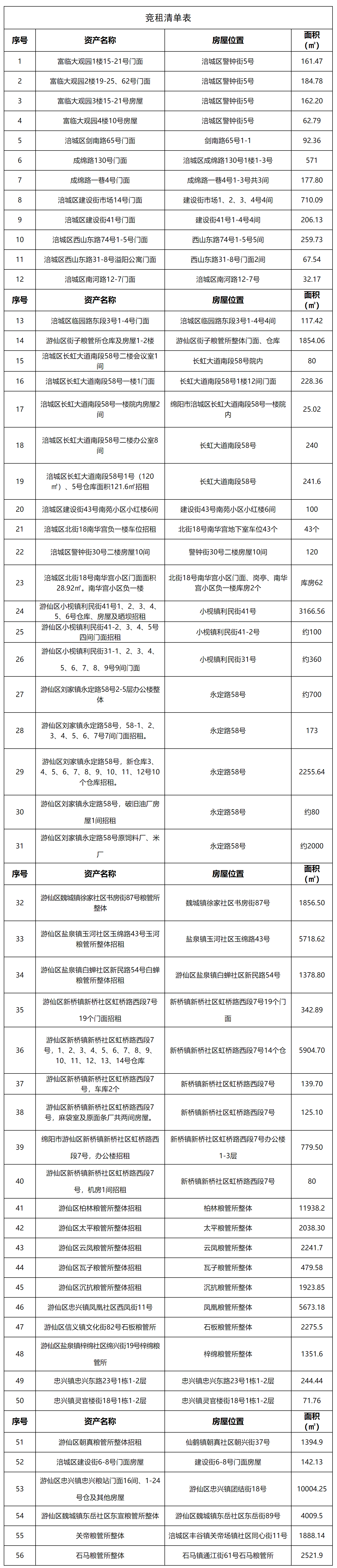 綿陽市眾一糧油有限公司現(xiàn)有門面、倉(cāng)庫(kù)、住房及其他資產(chǎn)面向社會(huì)公開競(jìng)租(詳見競(jìng)租清單)