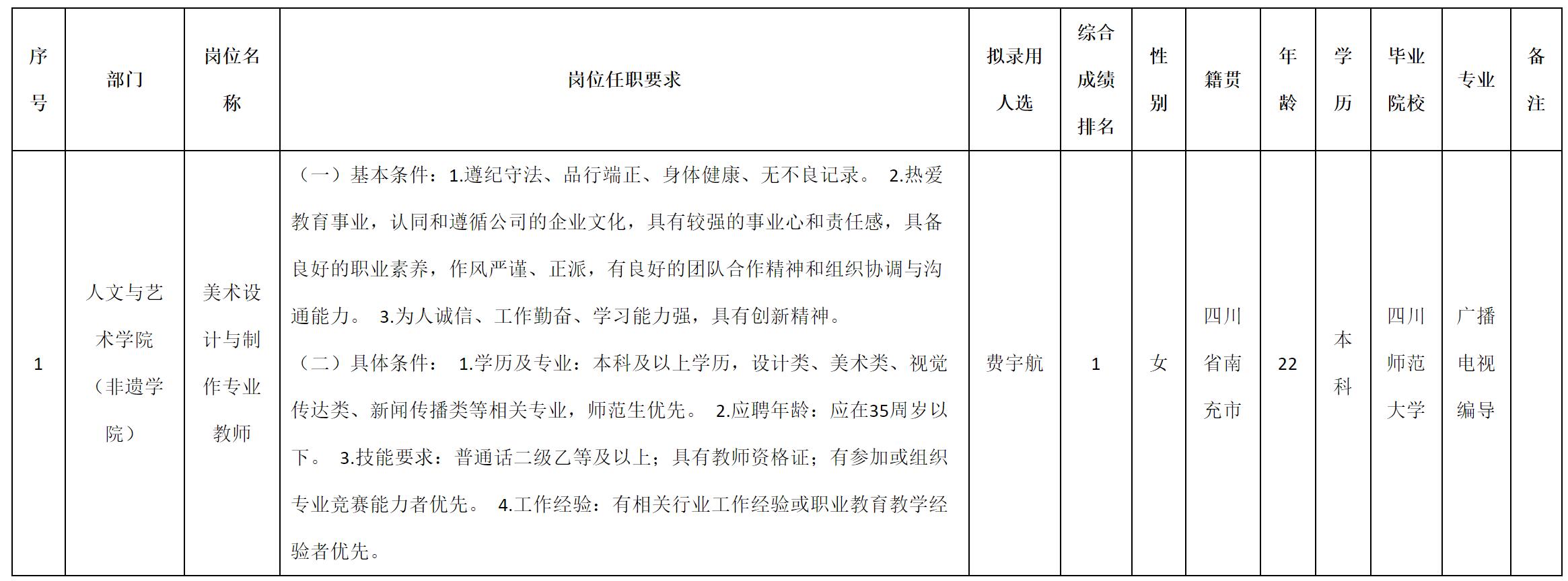 根據(jù)四川九洲教育投資管理有限公司發(fā)布的招聘公告及招聘相關規(guī)定,經(jīng)測試、考察、體檢等程序,擬錄用費宇航同志到四川九洲教育投資管理有限公司工作,現(xiàn)予以公示,具體情況如下:
