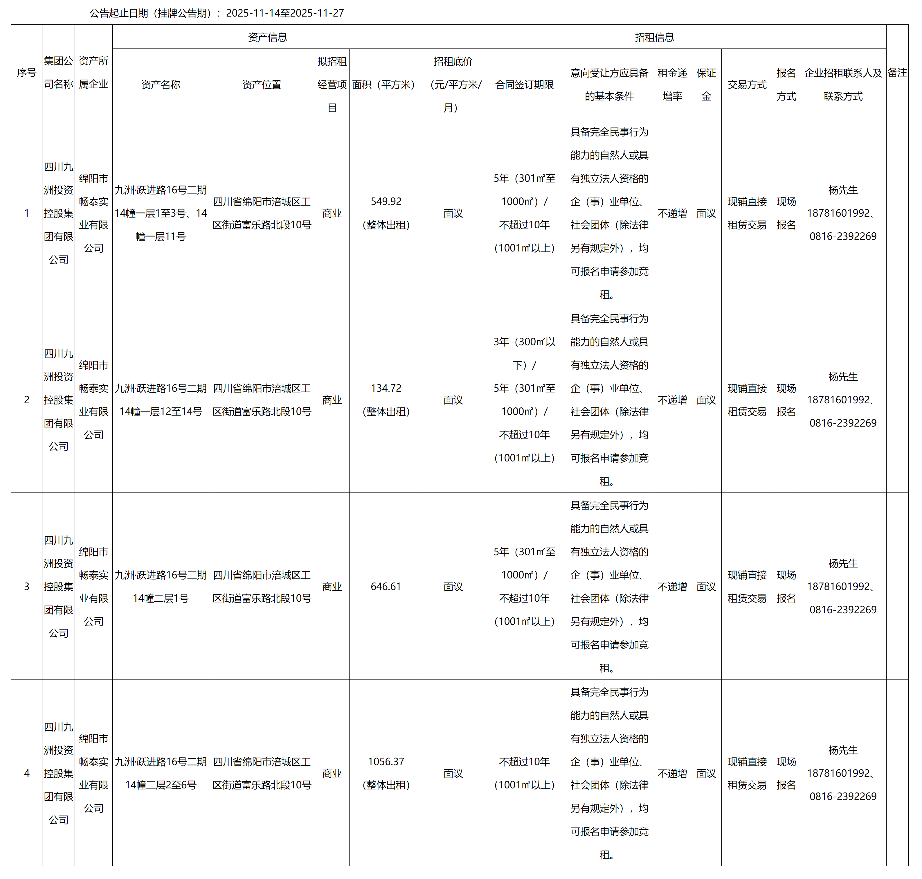 四川九洲千城商業(yè)管理有限公司九洲躍進(jìn)路16號二期14幢樓商鋪出租公告