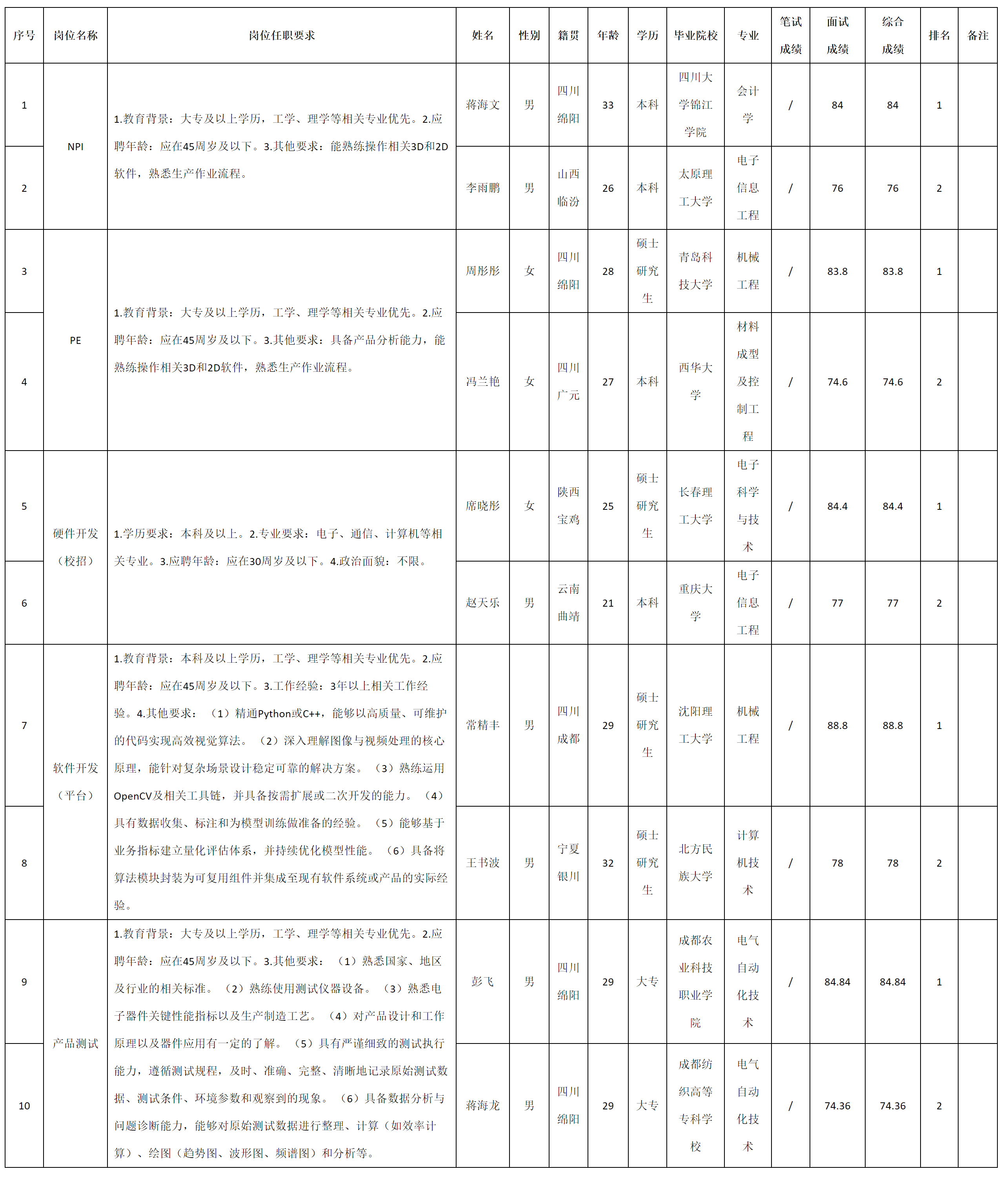 根據(jù)四川九州電子科技股份有限公司發(fā)布的招聘公告及招聘相關(guān)規(guī)定,現(xiàn)將測(cè)試成績(jī)予以公示。
