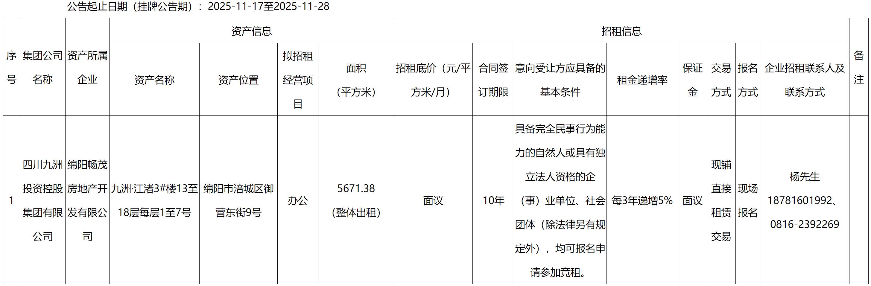 四川九洲千城商業(yè)管理有限公司涪城項目部九洲江渚項目房屋出租公告