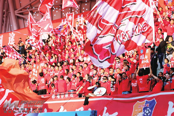 看臺(tái)上,球迷為隊(duì)員吶喊助威。 記者 陳冬冬 攝
