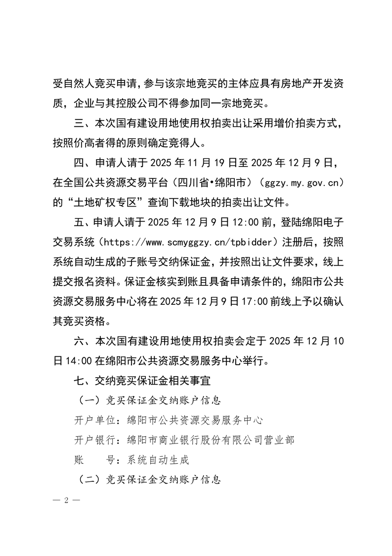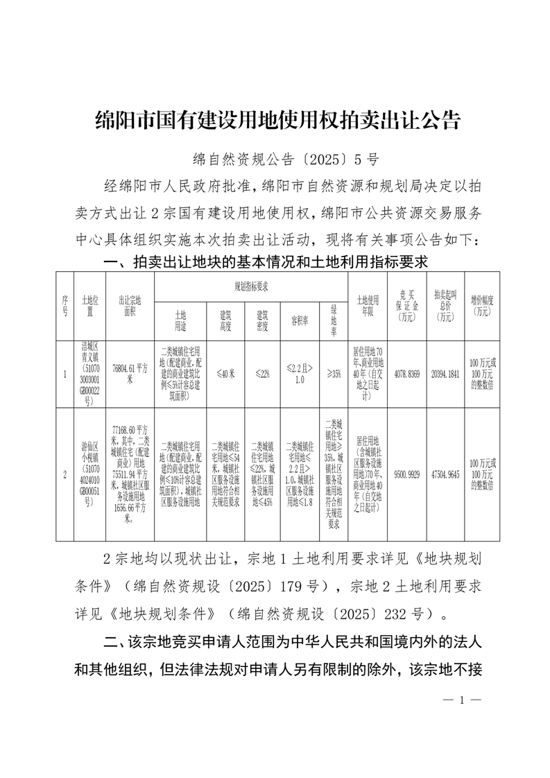 綿陽市國有建設(shè)用地使用權(quán)拍賣出讓公告(綿自然資規(guī)公告〔2025〕5號)