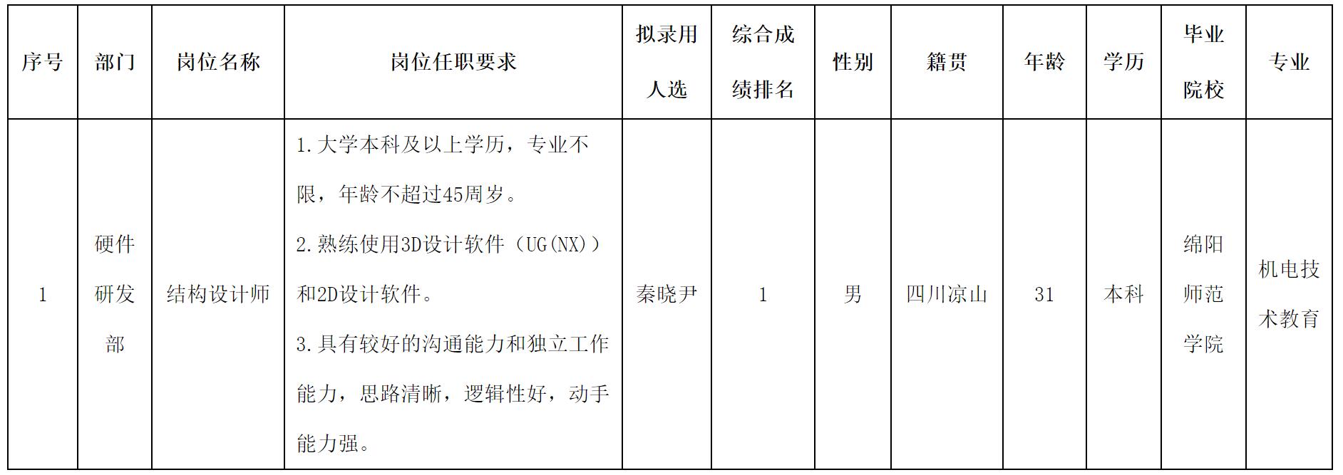 根據(jù)四川長虹新網(wǎng)科技有限責任公司發(fā)布的招聘公告及招聘相關規(guī)定,經(jīng)面試、考察、體檢等程序,擬錄用秦曉尹同志到公司工作,現(xiàn)予以公示,具體情況如下:
