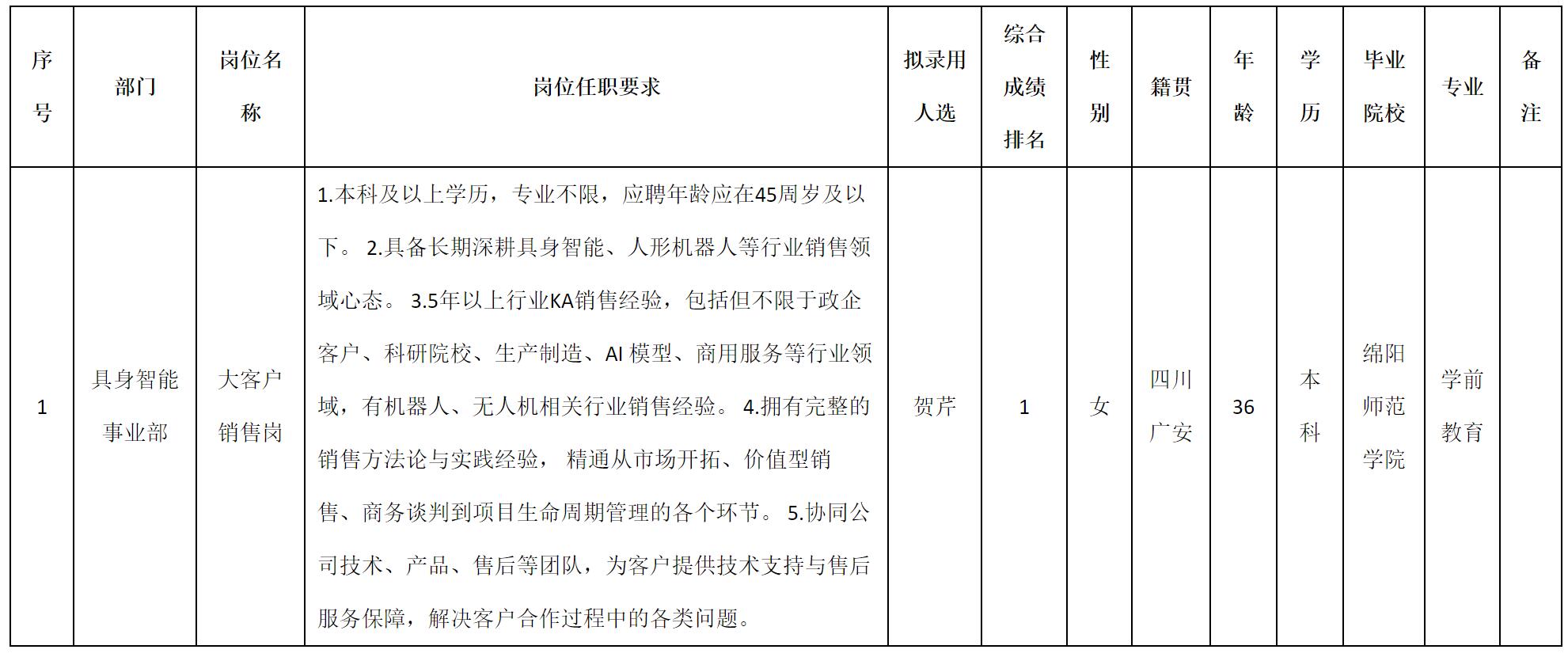 根據(jù)四川九洲投資控股集團(tuán)有限公司軟件與數(shù)據(jù)智能軍團(tuán)發(fā)布的招聘公告及招聘相關(guān)規(guī)定,經(jīng)測試、考察、體檢等程序,擬錄用賀芹同志到四川九洲投資控股集團(tuán)有限公司軟件與數(shù)據(jù)智能軍團(tuán)工作,現(xiàn)予以公示,具體情況如下: