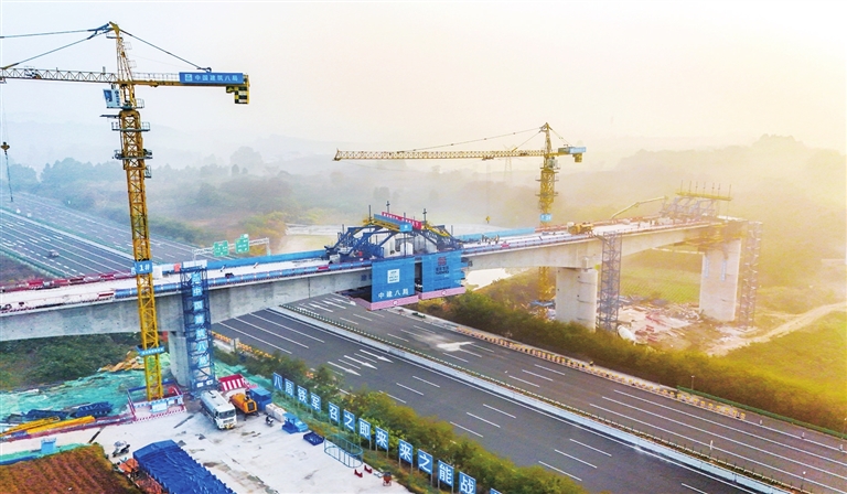 12月10日,綿遂資內(nèi)鐵路牌坊灣特大橋跨漢蓉高速連續(xù)梁順利合龍。記者 王勇 攝