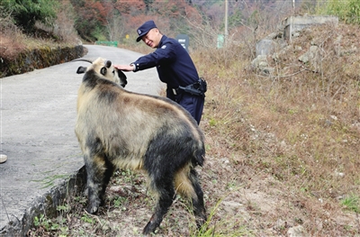 據(jù)平武縣公安局古城派出所所長張浩介紹,當天巡護車輛駛入保護區(qū)僅幾分鐘,“王德福”便慢悠悠走向警車。“它像見到老朋友一樣,慢慢靠近我們,還用頭蹭我的手。”張浩回憶道,一人一?;恿撕脦追昼姾?,“王德福”才搖搖腦袋蹦跶著走進林區(qū)深處。