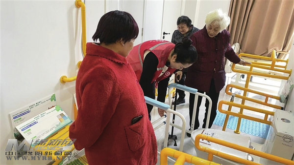 工作人員指導(dǎo)老年人使用適老化改造設(shè)施。 趙瑩 攝