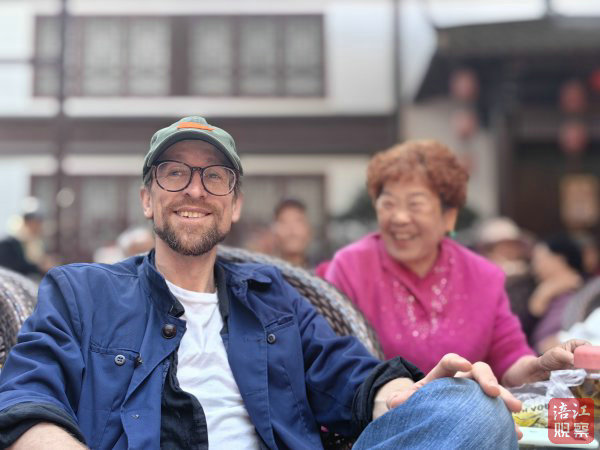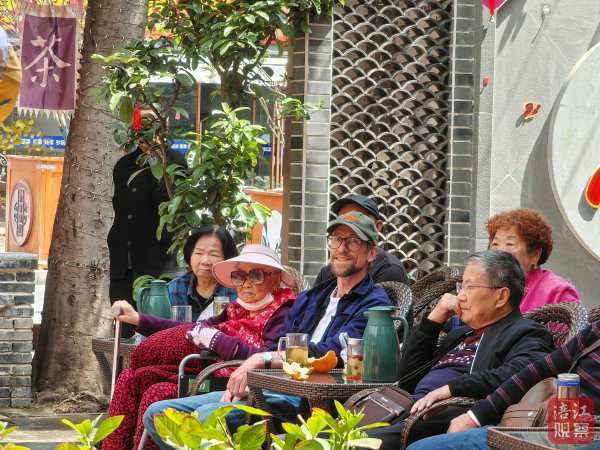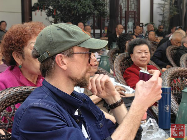 陽(yáng)光透過樹葉的縫隙,帶來絲絲熱氣。不斷有戲迷前來,他們熱情地與葛安喬打招呼,“美國(guó)朋友,歡迎你來看川劇”。葛安喬用滿臉的微笑回應(yīng),并送上一句,“你好”。