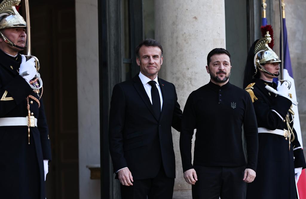 3月26日,法國總統馬克龍(中左)在巴黎總統府愛麗舍宮迎接到訪的烏克蘭總統澤連斯基。新華社記者高靜攝