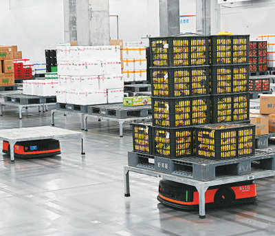 近年來,湖北省襄陽市依托大數(shù)據(jù)、云計(jì)算及人工智能等技術(shù),實(shí)現(xiàn)物流運(yùn)作的規(guī)?;?、集約化和智慧化。圖為在襄陽市樊城區(qū)好鄰居生鮮物流中心,兩臺智能運(yùn)送機(jī)器人在貨物運(yùn)送軌道上相遇后,按優(yōu)先級先后通過。新華社記者 黃曉勇攝