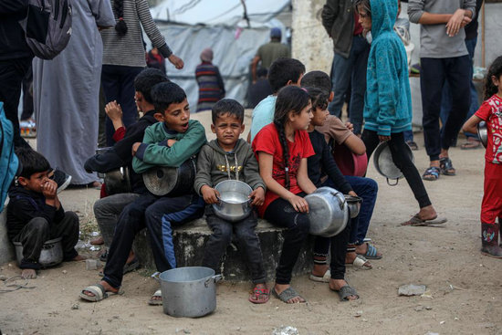 5月2日,孩子們在加沙城等待領(lǐng)取救助食物。新華社發(fā)(里澤克·阿卜杜勒賈瓦德攝)