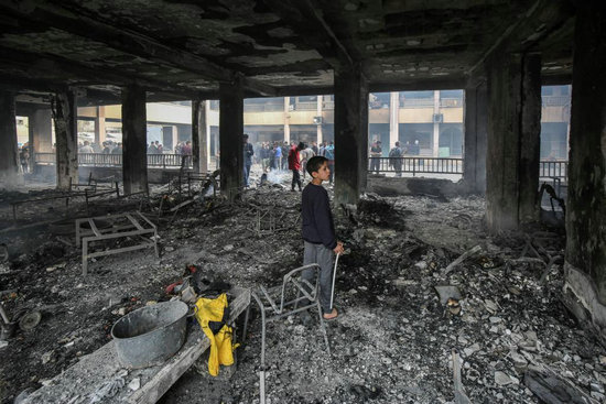 4月23日,在加沙地帶北部加沙城,人們查看以軍襲擊后的學(xué)校。新華社發(fā)(里澤克·阿卜杜勒賈瓦德攝)