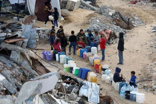 2月19日,在加沙地帶北部拜特哈嫩,兒童排隊等待取水。新華社發(fā)(里澤克·阿卜杜勒賈瓦德攝)