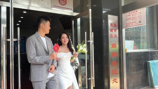5月10日,在北京市西城區(qū)婚姻登記處,一對辦理完結(jié)婚登記的新人走出大門(視頻截圖)。新華社記者 龐元元 攝