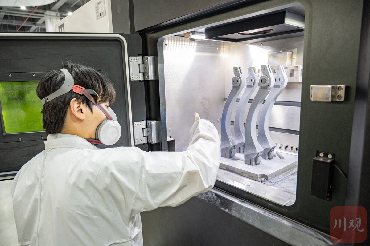 四川五八增材科技有限公司內(nèi),工作人員操作“金屬3D打印機(jī)”,正在“打印”機(jī)器狗的下肢。攝影/趙明