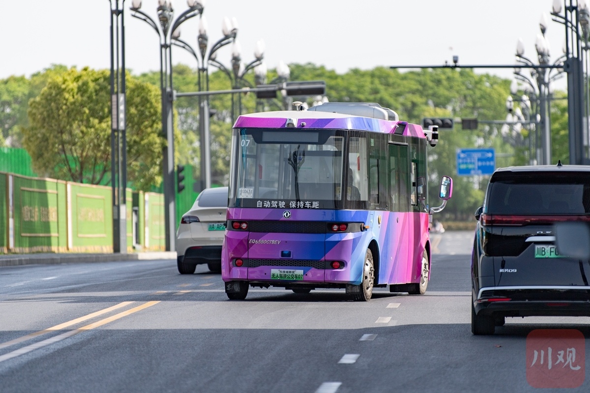 綿陽(yáng)無(wú)人駕駛公交車(chē)正在行駛中。攝影/趙明