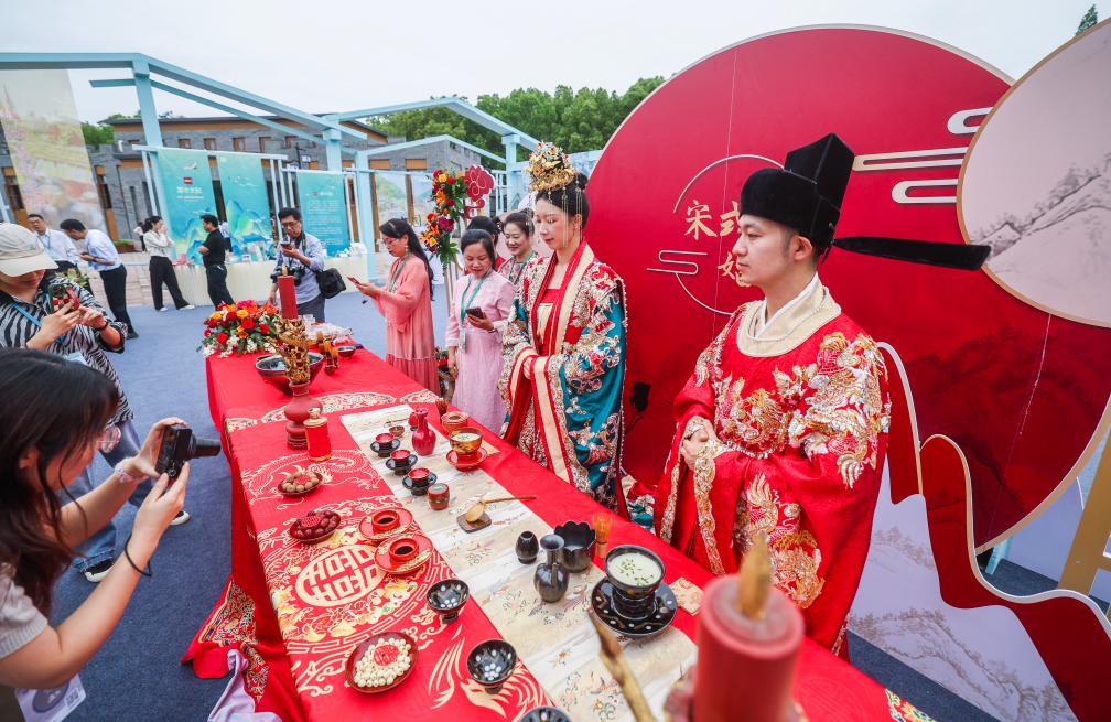 5月19日,在2025年“中國旅游日”全國主會場寧波寧海,當(dāng)?shù)?ldquo;宋式婚俗”旅游產(chǎn)品展示吸引游客拍照打卡。新華社記者徐昱 攝