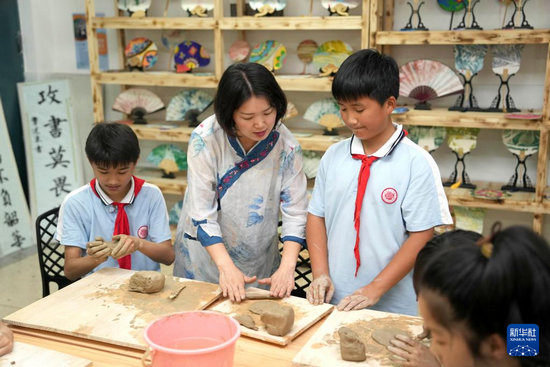 5月21日,老師(左二)在吉首市芙蓉學校指導學生制作泥塑。