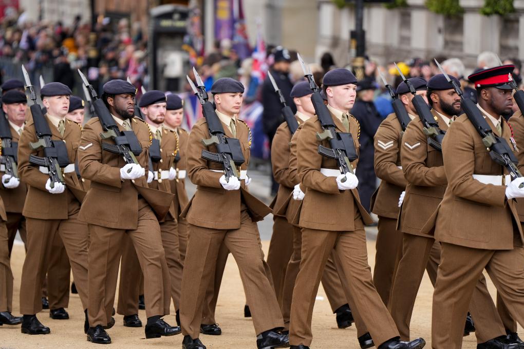 5月5日,在英國倫敦,軍人參加閱兵儀式。當(dāng)日,英國舉行活動(dòng)紀(jì)念第二次世界大戰(zhàn)歐洲戰(zhàn)場勝利80周年。新華社記者吳魯攝