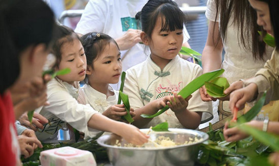 5月31日,在四川省瀘州市青少年服務(wù)中心,孩子們?cè)趯W(xué)習(xí)包粽子。新華社發(fā)(劉學(xué)懿攝)