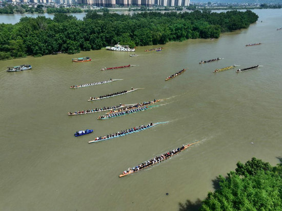 5月31日,在福州市閩侯縣大樟溪南港段,民間龍舟隊(duì)在端午競(jìng)渡活動(dòng)中比拼(無(wú)人機(jī)照片)。新華社記者 姜克紅 攝