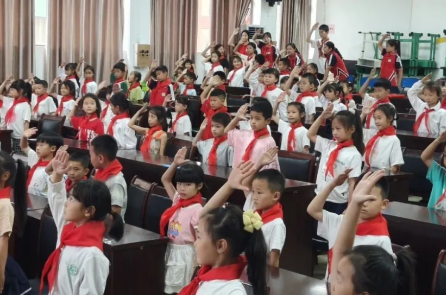 隨后,全體新隊(duì)員在隊(duì)旗下莊嚴(yán)宣誓,鏗鏘有力的誓言回蕩在校園上空,表達(dá)著他們?yōu)楣伯a(chǎn)主義事業(yè)貢獻(xiàn)力量的決心。