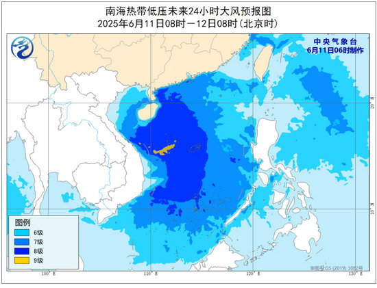 大風預報:6月11日08時至12日08時,巴士海峽、南海大部、北部灣、瓊州海峽、南沙群島、中沙群島、廣東沿海、海南島沿海將有6-8級大風,南海中西部、西沙群島附近海域的風力將有9級,陣風可達10-11級。