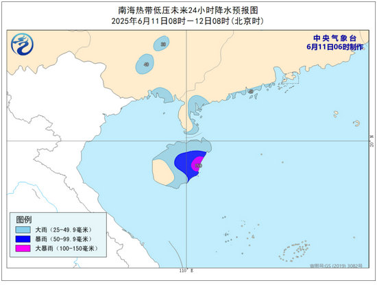 降水預報:6月11日20至6月12日08時,廣東中西部沿海、廣西沿海、海南島大部、西沙群島等地有大雨,其中,海南島中東部的部分地區(qū)有暴雨或大暴雨(100~150毫米)。