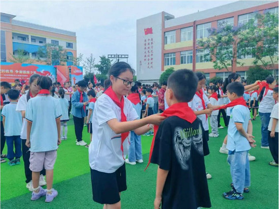五、六年級(jí)的少先隊(duì)員代表們和該校領(lǐng)導(dǎo)以及一、二年級(jí)輔導(dǎo)員們共同為新隊(duì)員們授紅領(lǐng)巾,大隊(duì)委的隊(duì)員們?yōu)橐荒昙?jí)輔導(dǎo)員們佩戴紅領(lǐng)巾,紅領(lǐng)巾在他們手中傳遞,是理想的傳承、是信念的傳承。